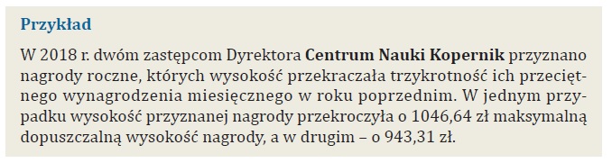 W 2018 r. dwóm zastępcom/czyniom Dyrektora przyznano nagrody roczne (odpowiednio: 27 456,00 zł i 26 760,00 zł), których wysokość przekraczała trzykrotność ich przeciętnego wynagrodzenia miesięcznego w roku poprzednim, co stanowiło naruszenie tzw. ustawy kominowej.