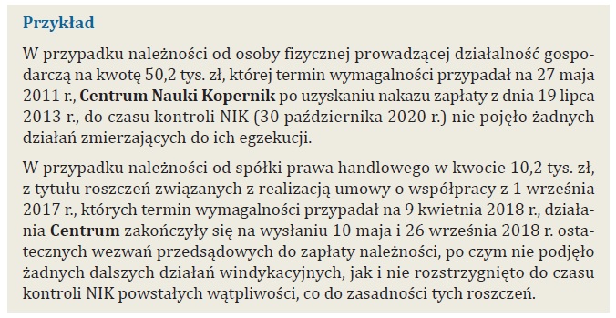 - na kwotę 50,2 tys. zł. Termin wymagalności przypadał na 27 maja 2011 r. CNK uzyskało nakaz zapłaty w dniu 19 lipca 2013 r., ale do czasu kontroli NIK (30 października 2020 r.) nie pojęto żadnych działań zmierzających do egzekucji;