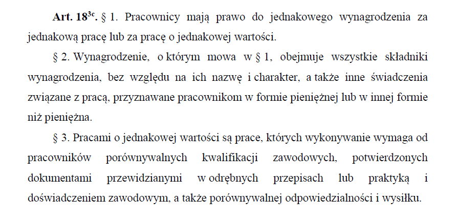 Od 1 lipca (wtedy wchodzą w życie zmiany w Regulaminie Pracy) będziesz mogła/mógł bez skrępowania rozmawiać z koleżankami i kolegami z pracy o Waszych zarobkach. Po co? Na przykład po to, żebyście mieli rozeznanie czy są realizowane Wasze prawa do równego traktowania w zatrudnieniu. Przykład obowiązującego w tej kwestii prawa poniżej.