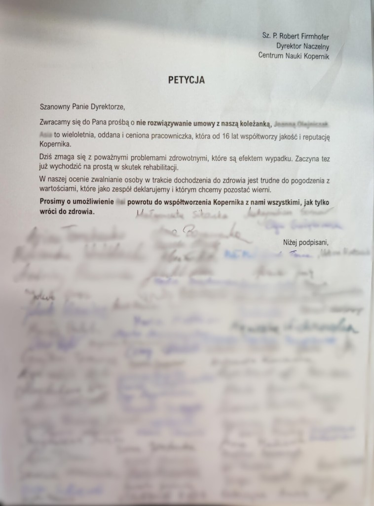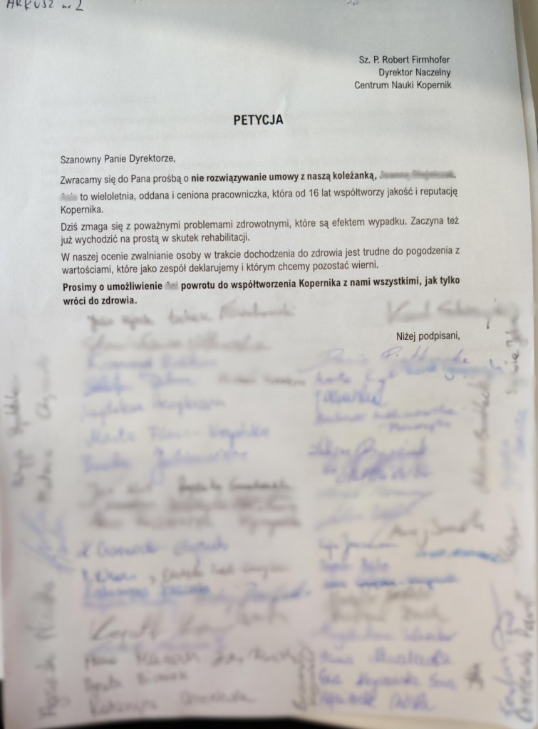 W czwartek 12.02 otrzymaliśmy od Pracodawcy pismo, w którym poinformował nas o zamiarze rozwiązania umowy z jedną z wieloletnich pracownic Kopernika. Jako powód podano „długotrwałą niezdolność pracownika do pracy spowodowaną chorobą, trwająca dłużej niż okresy ochronne przewidziane w art. 53 par. 1 pkt b Kodeksu pracy.”