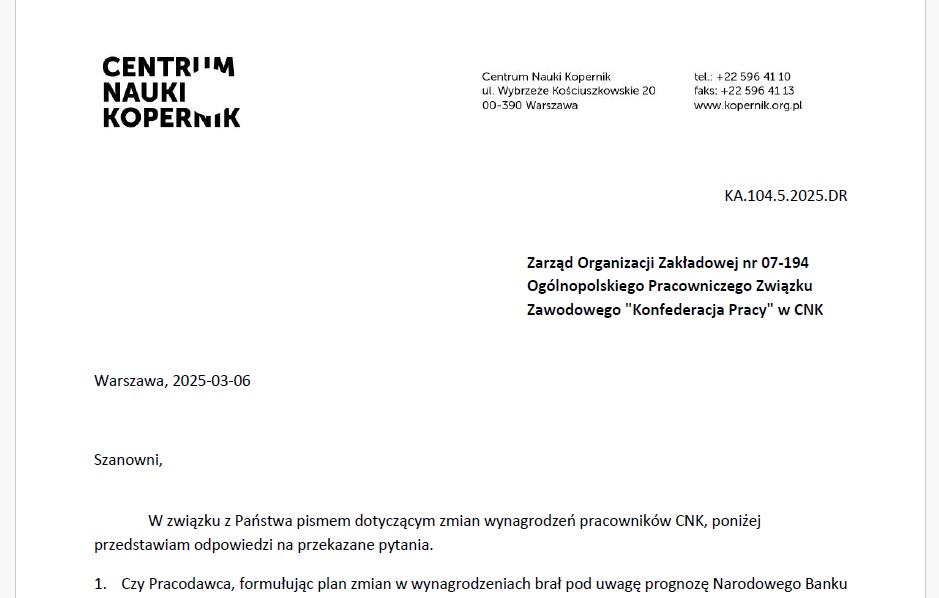 Zwróciliśmy sięjuż do Pracodawcy o przekazanie nam danych dot. wynagrodzeń od marca. Posłużą nam do przeprowadzenia analizy możliwości finansowych pracowników CNK, już po marcowej korekcie wynagrodzeń.