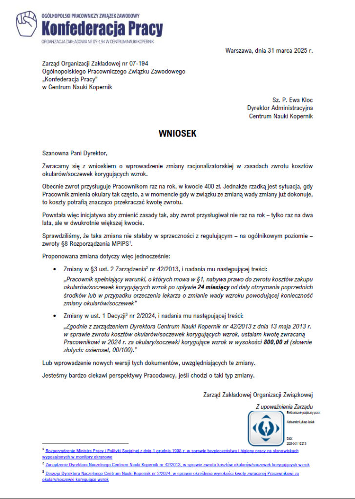 Po przedyskutowaniu sprawy w gronie członków i członkiń, złożyliśmy wniosek do Dyrekcji z prośbą o rozpatrzenie zmiany w regulacjach dotyczących dofinansowania zakupu okularów.